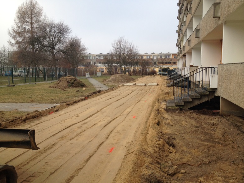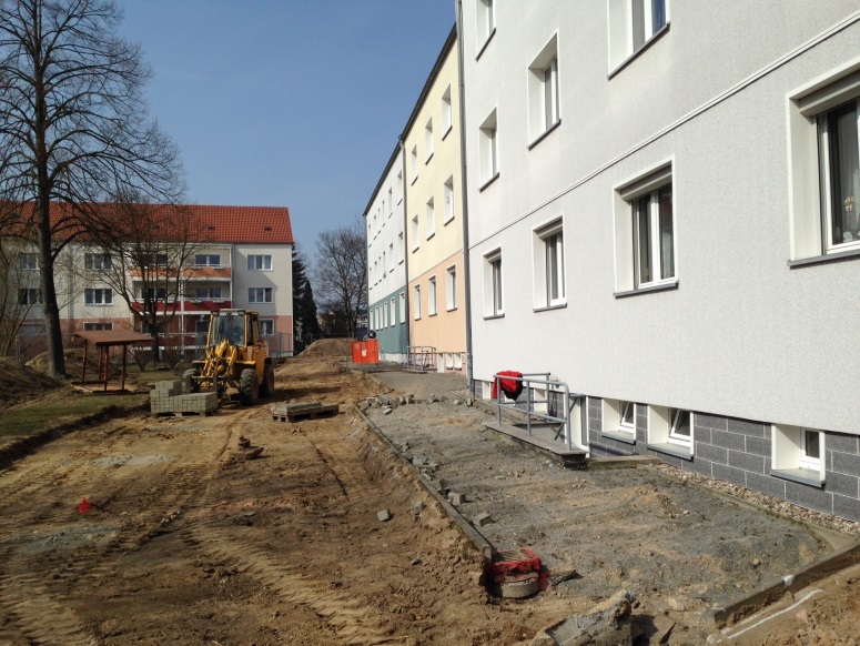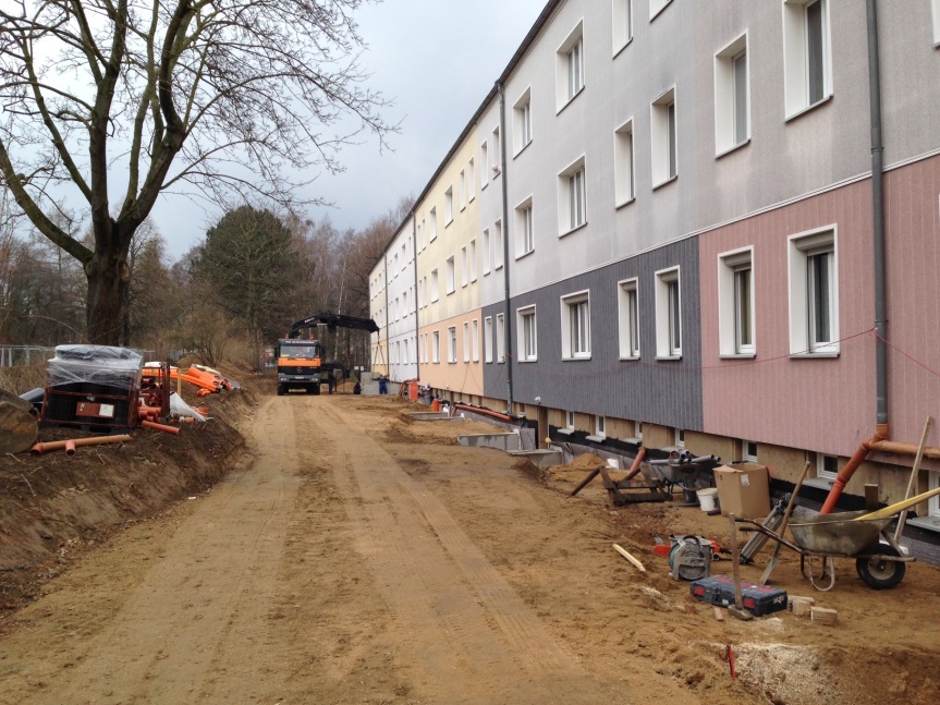 Die Bautätigkeiten an unserem Wohnobjekt in Rauschwalde, der Hilde-Coppi-Straße 1 – 5, haben Ende März begonnen. Die Tiefbaufirma erstellt die Baustraße, so dass mit den Abdichtarbeiten und der Erstellung der Balkonfundamente pünktlich angefangen werden kann.